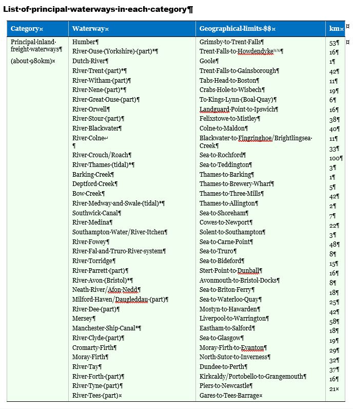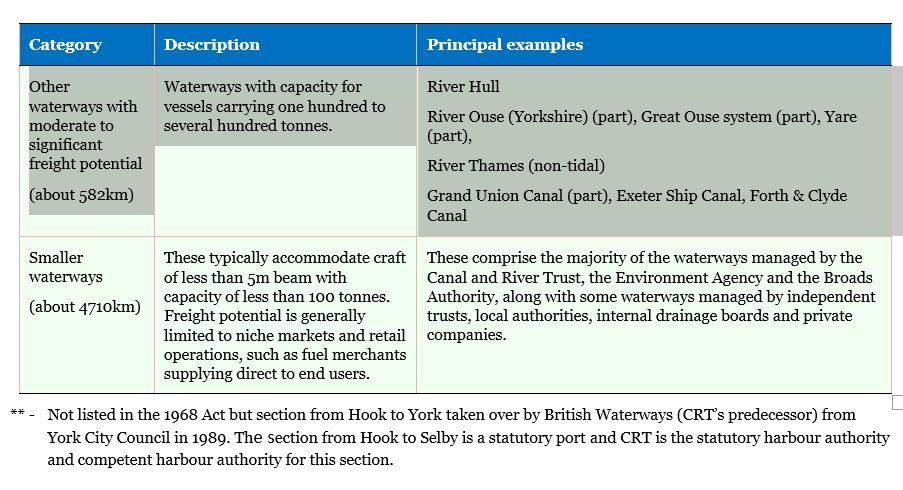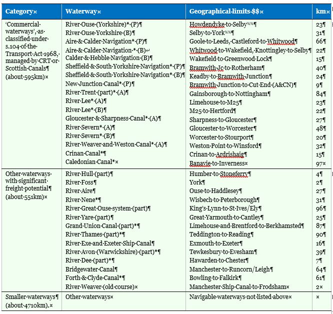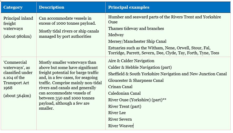 * – Included in DfT list of Key or Core Waterways with freight potential[1] (note this classification did not include many of the estuarial waterways, which are among the most important freight waterways)