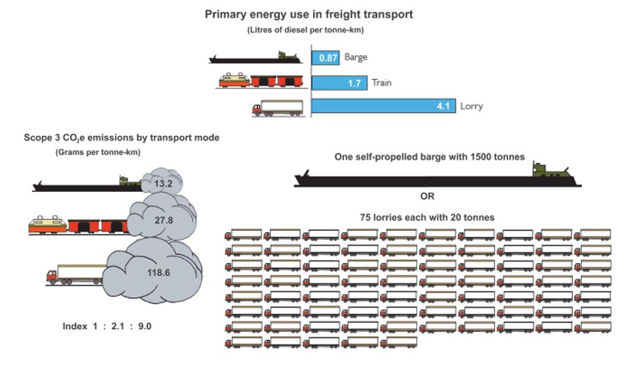 1.6. Use of waterway transport can have environmental benefits in terms of reducing fuel use per tonne kilometre and reducing traffic congestion and emissions associated with slow moving and stationary vehicles. Transporting the same tonnage of freight between two points by water instead of road has the potential to reduce by three quarters the amount of carbon dioxide equivalent (CO2e) emitted (see diagram below). Efficiency can be improved further where sustainable fuels are used and tides can be used beneficially to provide free, natural energy.