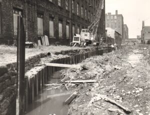 [The photo above shows installing new piling during restoration work, looking towards Bridge 5 at Ancoats on the Ashton Canal. The photo left shows restoration work at Dukinfield Junction, also on the Ashton Canals – photos from IWA collection, photographer unknown, but probably Harry Arnold]