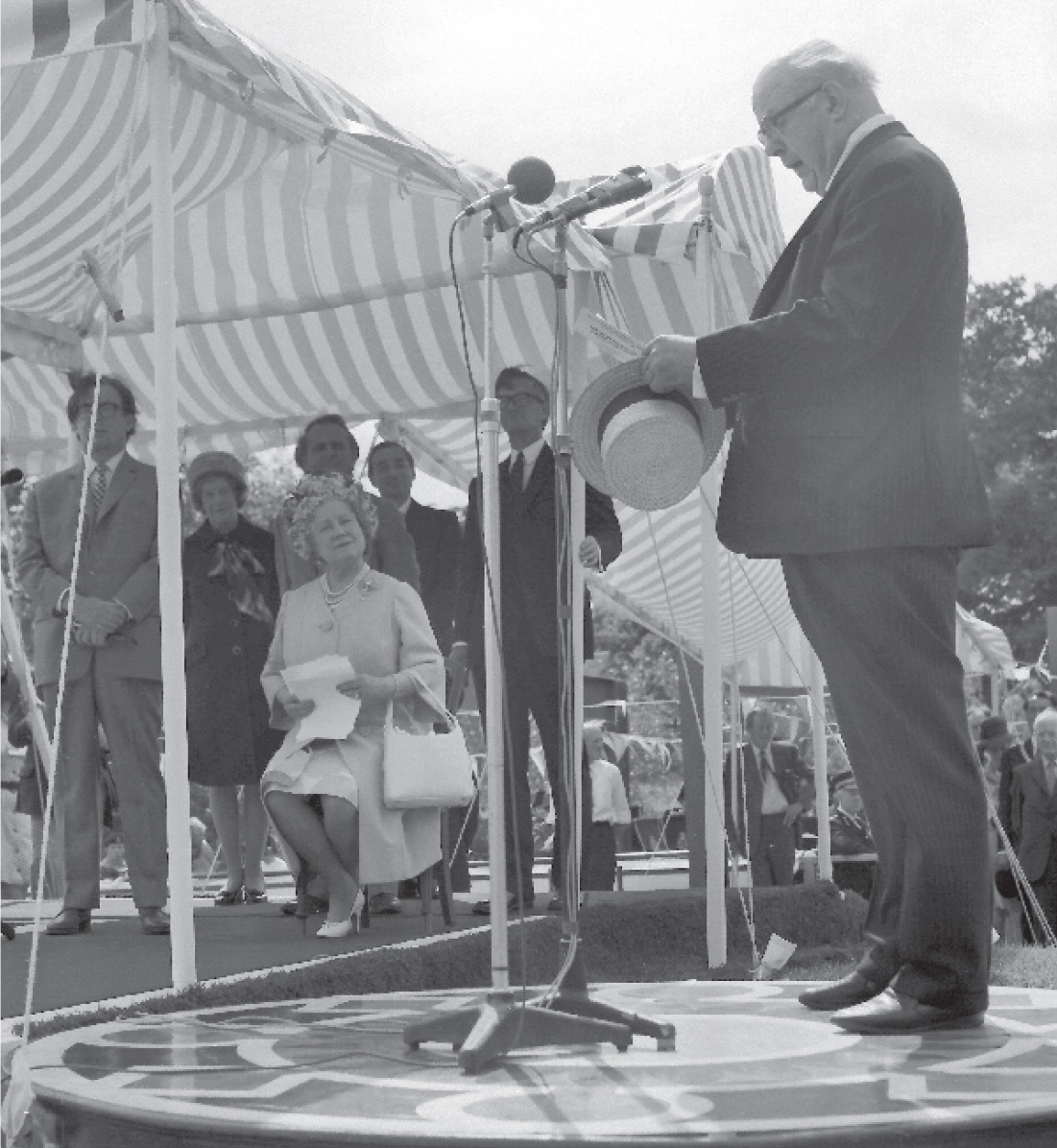 At that 1964 event Aickman told the Queen Mother that he now intended to start working on the restoration of the Upper Avon Navigation, which was still in a state of dereliction. The Queen Mother vowed that, if he did, she would be pleased to formally reopen it. Ten years later, on 1st June 1974, she met her promise and the reopening ceremony was held at the Upper Avon’s new top lock. Among those in the official entourage was the Poet Laureate John Betjeman, also a prominent IWA member on Aickman’s persuading, and he read a poem he had written for the occasion, which concluded: