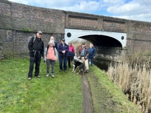I decided instead that we would meet up in Wood Lane by Pelsall Works Bridge and then drive to the pub afterwards. Eight walkers assembled in bright sunshine, amongst them a few new faces. We joined the Cannock Extension Canal by Pelsall Junction and walked as far as Pelsall Road Bridge. We then crossed a field in the direction of Brownhills. Wyrley Common is full of disused coal shafts and several former mineral railways. We stepped down onto the Norton Branch of the London, Midland and Scottish Railway (LMS). This branch line primarily transported coal from the Cannock Chase collieries to the main railway network. It remained in use until 1975. We followed its route southwards to Engine Lane, supposedly the site of a Newcomen engine. To our right we could just make out the bed of the Slough Arm, a private canal with one lock.