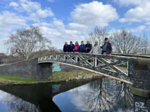 We re-joined the Curly Wyrley near Jolly Collier Bridge. The towpath becomes The Beacon Way at this point, and we wound our way westwards past the filled in Gilpin Arm, which was abandoned as far back as 1850. Near here there is an incongruous lock paddle on the grass with no sign of a sluice or water leading off it. This section of the canal was once heavily industrialised, now it is modern housing. One member of our group recalled fishing in the canal here as a child. Foundry Bridge and Yorks Foundry Bridge are all that remain of the Pelsall Coal and Iron Company, which became the largest prosperous company in the area. The York family owned property and ran businesses around here including the Fingerpost pub, which at that time was known as The Royal Oak.