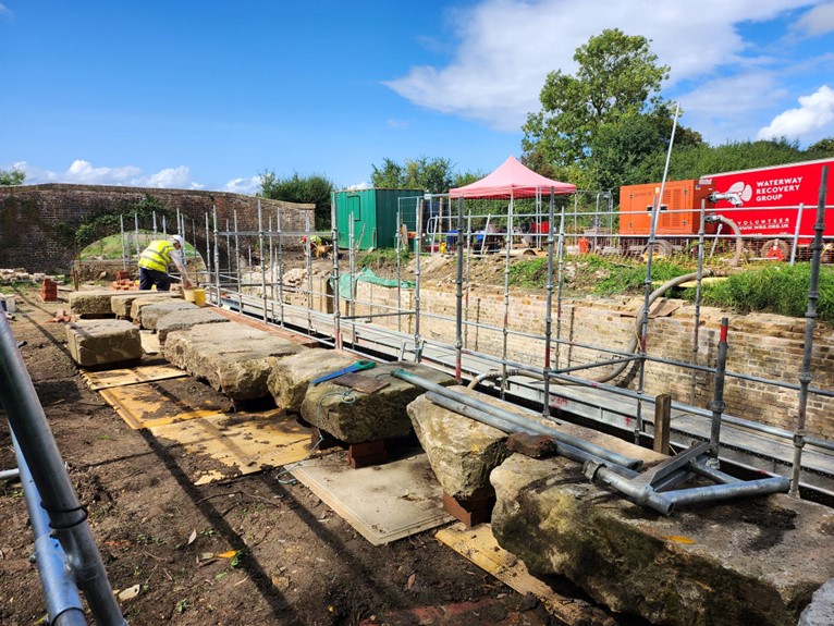 Current work is focussed on the ‘Phase 1b’ length of the Stroudwater Navigation, which is being rebuilt and reopened from Saul Junction to Stonehouse, reconnecting the Cotswold Canals (the Stroudwater and the Thames & Severn Canal) to the national canal network. This work is being supported by a major grant from the National Lottery Heritage Fund. Our work represents an important contribution to the overall project, as well as counting as part of the necessary ‘match funding’ required by the Lottery grant.