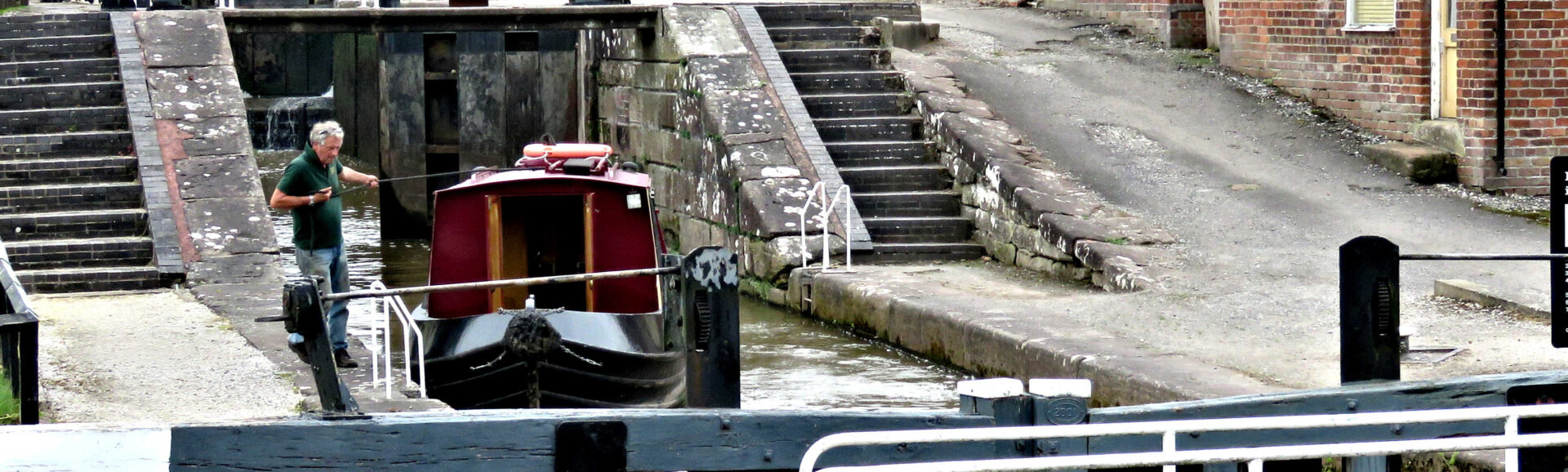 [The photo shows a narrowboat navigating the Bunbury staircase locks.]