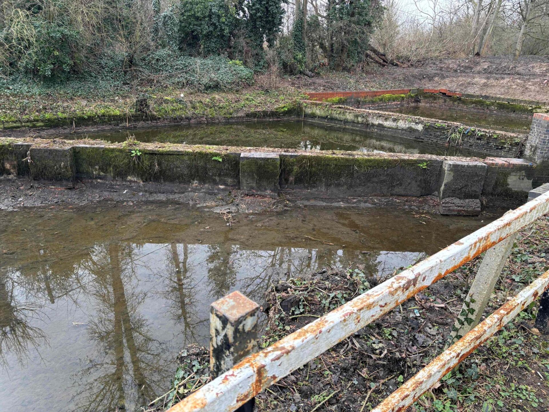 WRG will be working with the Canal and River Trust, which has cleared and dredged the two side-ponds to allow us access to the bottom of the walls. Standing water will be drained off.