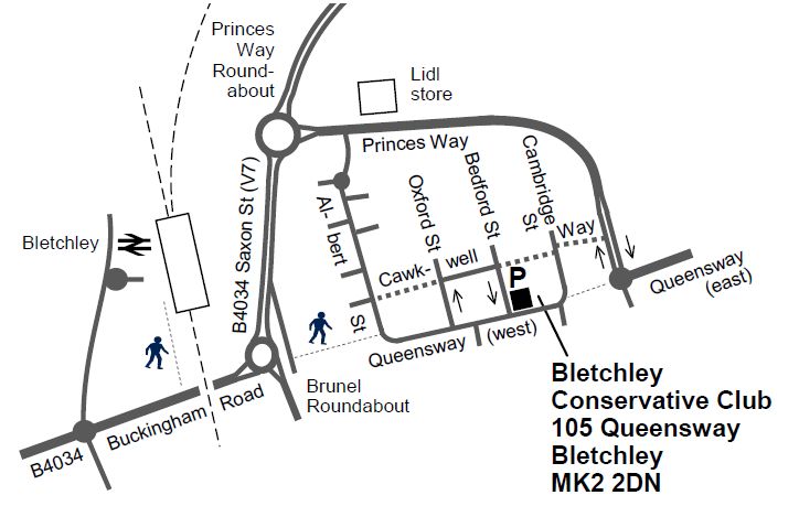 The venue is Bletchley Conservative Club, 105 Queensway, MK2 2DN