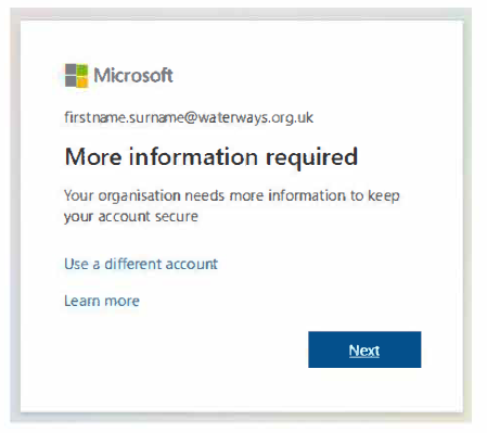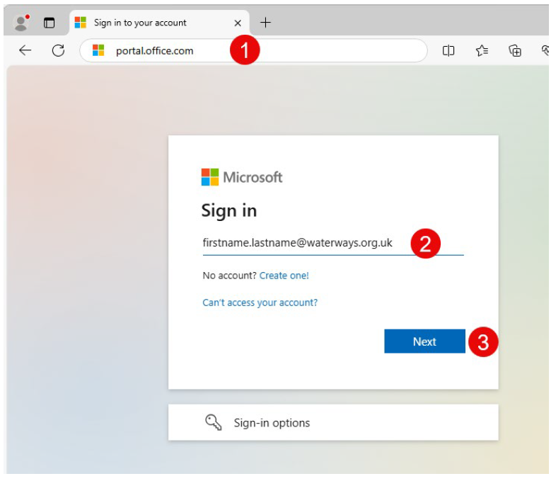 Simply open your preferred internet browser (For example: Google Chrome, Firefox or Safari) and visit https://portal.office.com/ and enter your IWA email address in the form firstname.lastname@waterways.org.uk, substituting your name (for example volunteer Sarah Smith would use [email protected]).