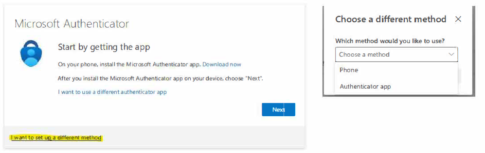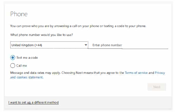 On the MFA setup page, choose I want to setup a different method and select the Phone option (highlighted below):