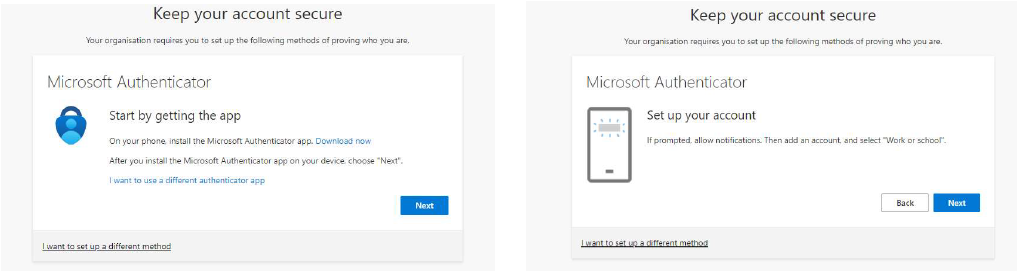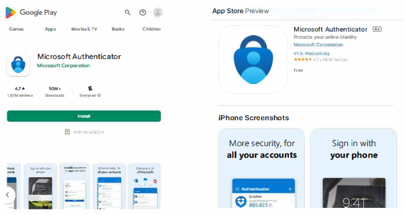 If not already installed, start by visiting the Google play store (Android) or Apple app store (iOS/iPadOS) on your phone to download the free Microsoft Authenticator app.