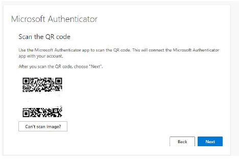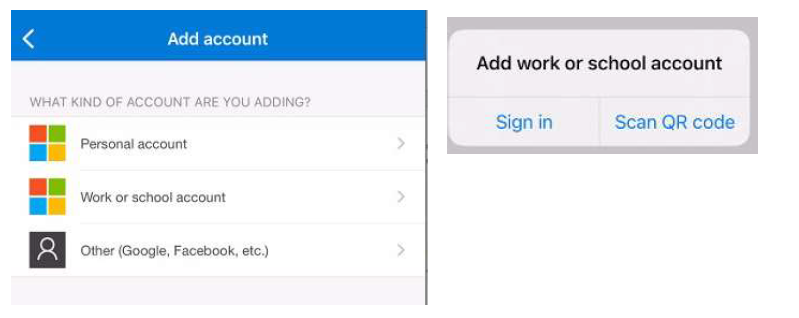 Next, open the Microsoft Authenticator app and choose Work or School Account, then select Scan QR Code.