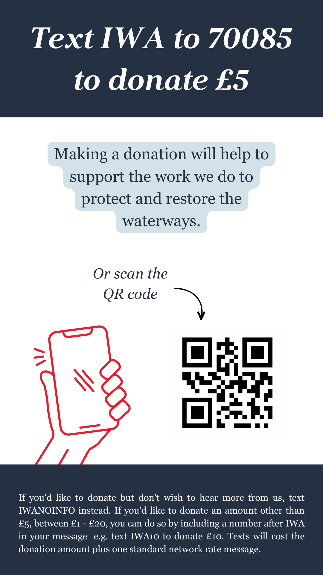 We will continue to promote the Text to Give option on social media to encourage more donations from our supporters, so please do engage with the posts by liking and sharing them. Alternatively, please consider promoting Text to Give on your dedicated branch social media accounts.  Please include a link to the public Text to Give page on the website: https://waterways.org.uk/text