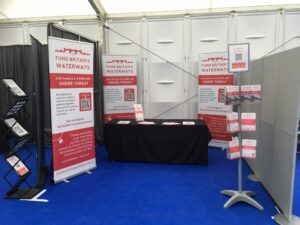 Right – FBW’s display in the Boating Marquee at Crick Boat Show (23rd to 26th May) – [photo by Stephen Busby]. Below – Flag at Crick Boat Show [by Shirley Sefton]
