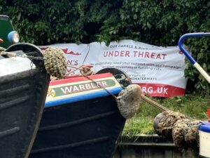 Anne Husar writes “At great personal risk (waterside on a very silted/muddy canal), my OH has bravely gone where no-one has before to attach this banner. There’s a lot of boat movement on the Shroppie at the moment, many more than last year we think, so hopefully this will attract curiosity/interest and is the best we can do at the moment with no boat engine to go anywhere!”