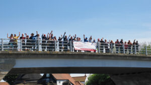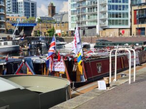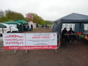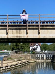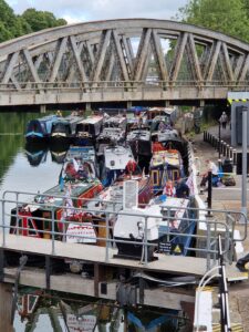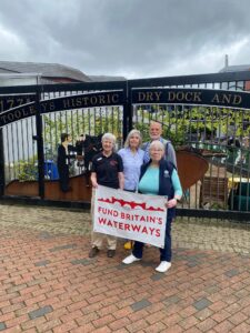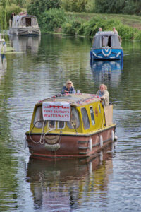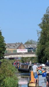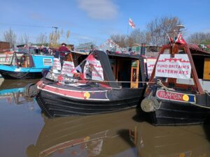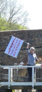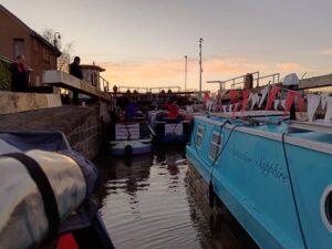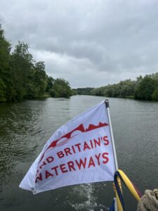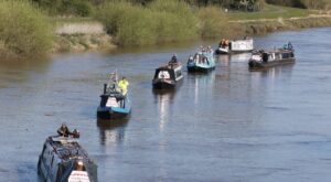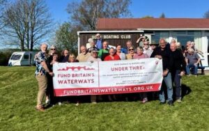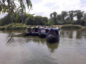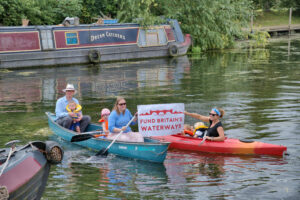 On Sunday 3rd August, a flotilla of boats travelled in convoy up the River Cam and assembled at Baits Bite Lock, to meet Charlotte Cane MP and draw attention to the threats facing Britain’s canals and navigable rivers as a result of inadequate funding. 15 narrowboats and cruisers, dressed with Fund Britain’s Waterways banners, made the journey from Bottisham Lock and were joined en route by a steam launch, a rowing boat and a kayak. They passed moored boats also dressed with banners and were applauded by supporters on the bank. A large group gathered at Baits Bite Lock including Cambridge city and county councillors and representatives of businesses and other organisations, united in their support for inland waterways and their call for investment to ensure their survival.
