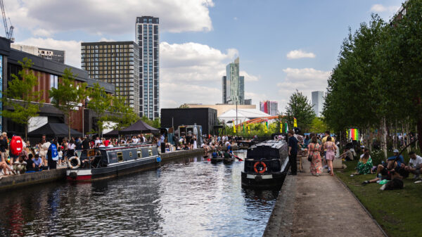[The photo the newly restored locks and surrounding development at a local community event – by Al Franco, Manchester Bolton & Bury Canal Society]